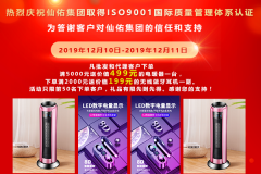 2019-12-10 17:28:10熱烈慶祝仙佑企業(yè)取得ISO9001國(guó)際質(zhì)量體系認(rèn)證,為答謝客戶對(duì)仙佑企業(yè)的信任和支持: 2019年12月10日-2019年12月11日,凡批發(fā)和代理客戶下單,滿5000元送價(jià)值 499元 的電暖氣一臺(tái),下單滿